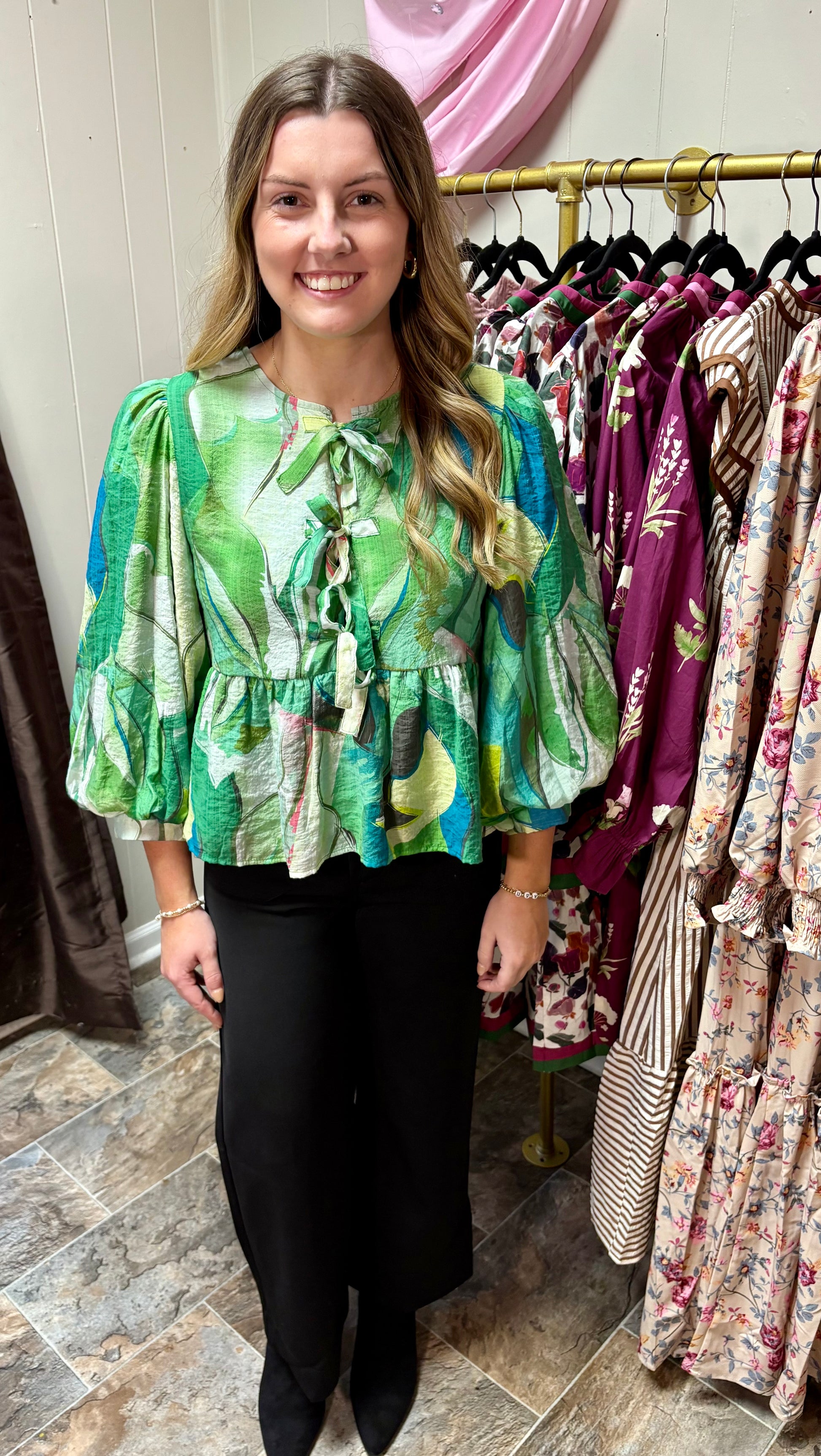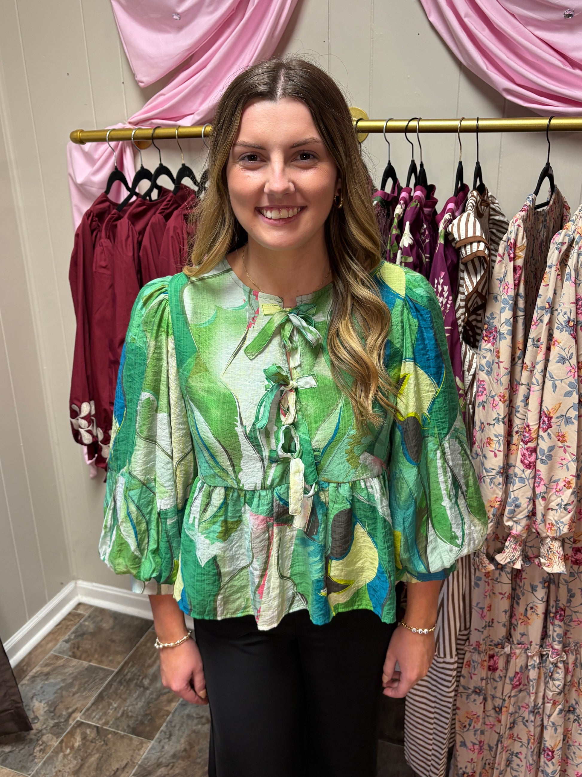 Abstract print, tiered ruffle ties, and billowy balloon sleeves, this breezy blouse is an instant showstopper. The flowy silhouette pairs perfectly with denim for a casual-cool look or dressed up with tailored trousers.