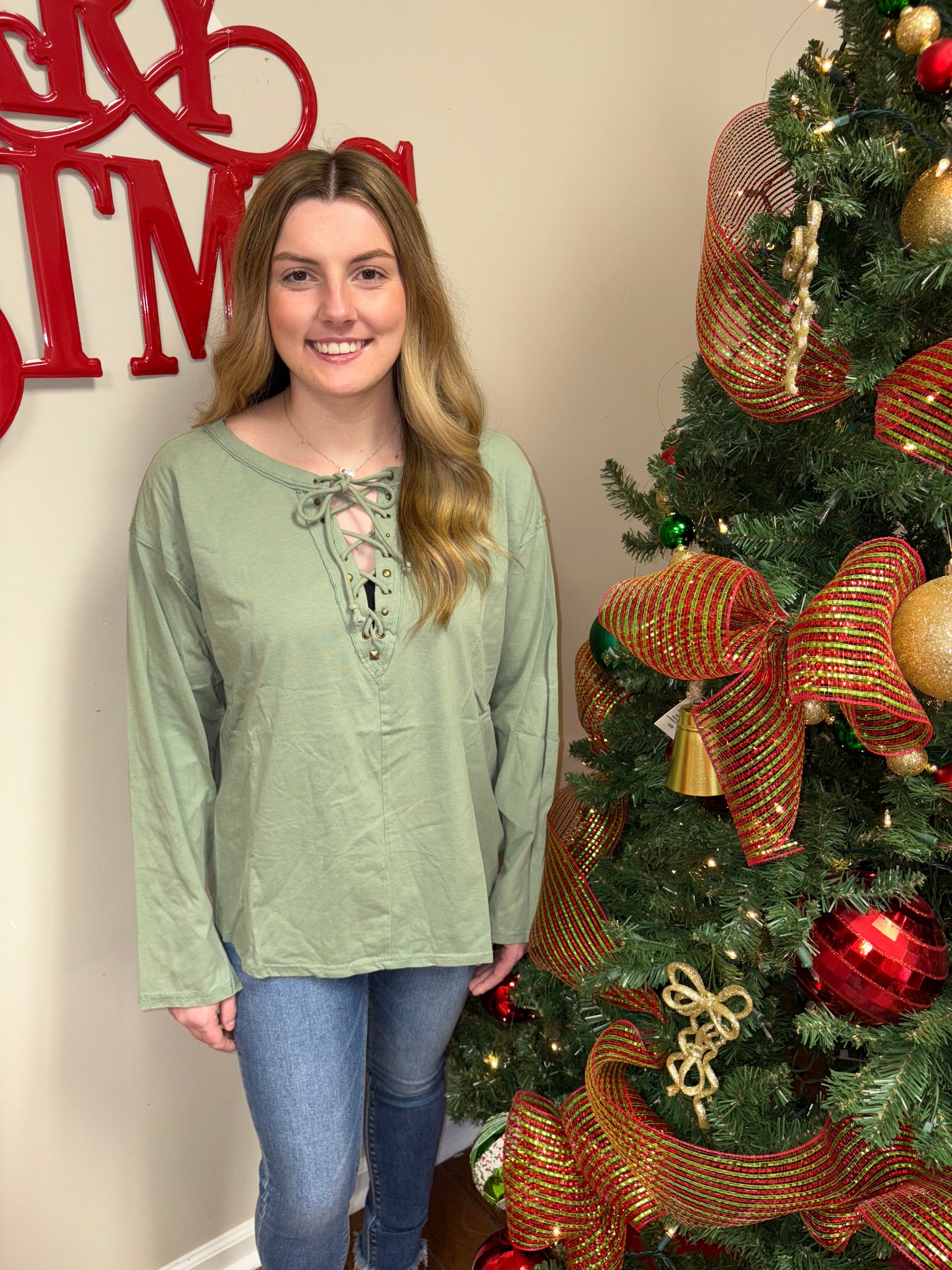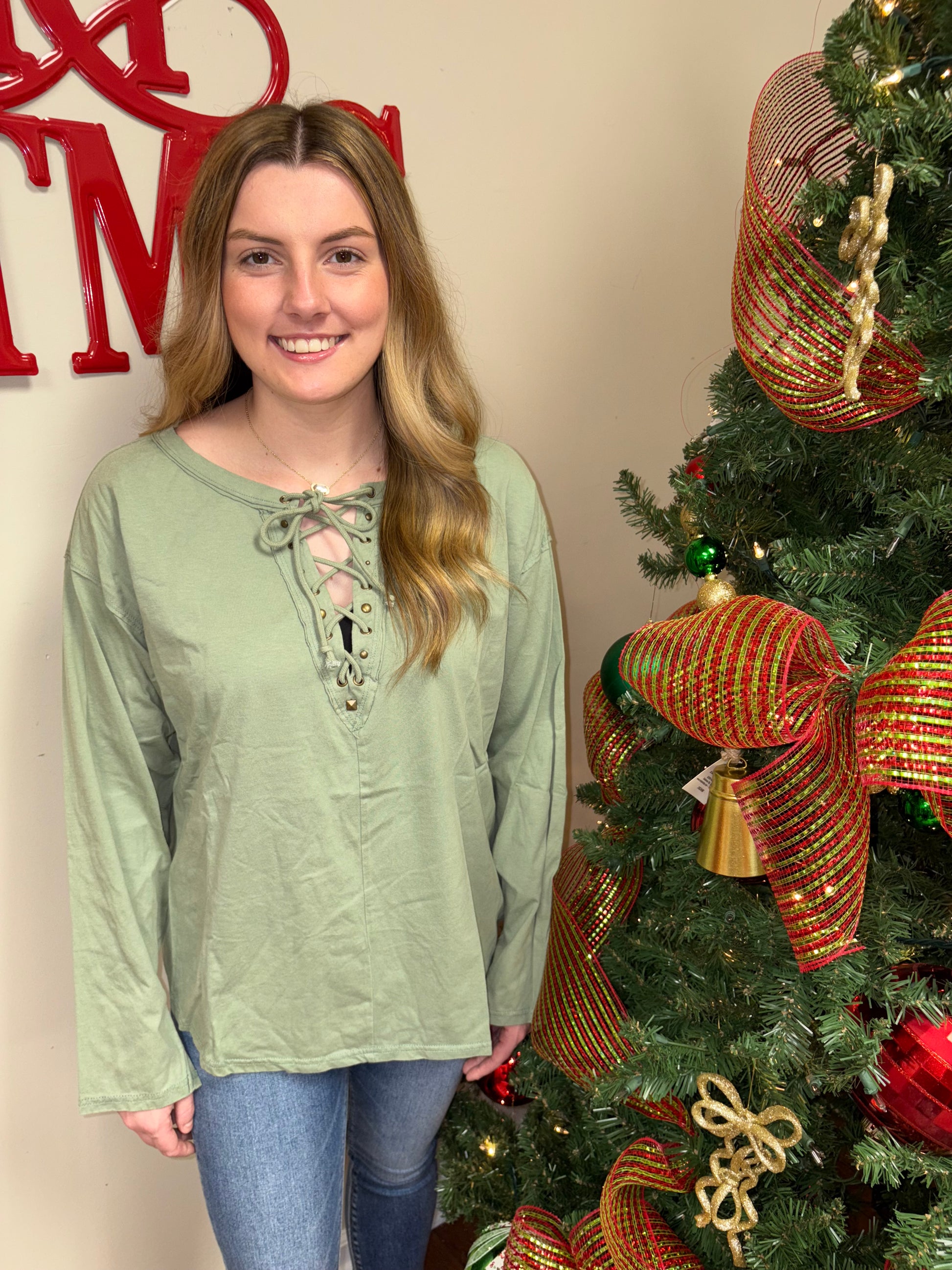 Lace Up Top with Long Sleeves, Raw Seam and Rounded Side Slits.