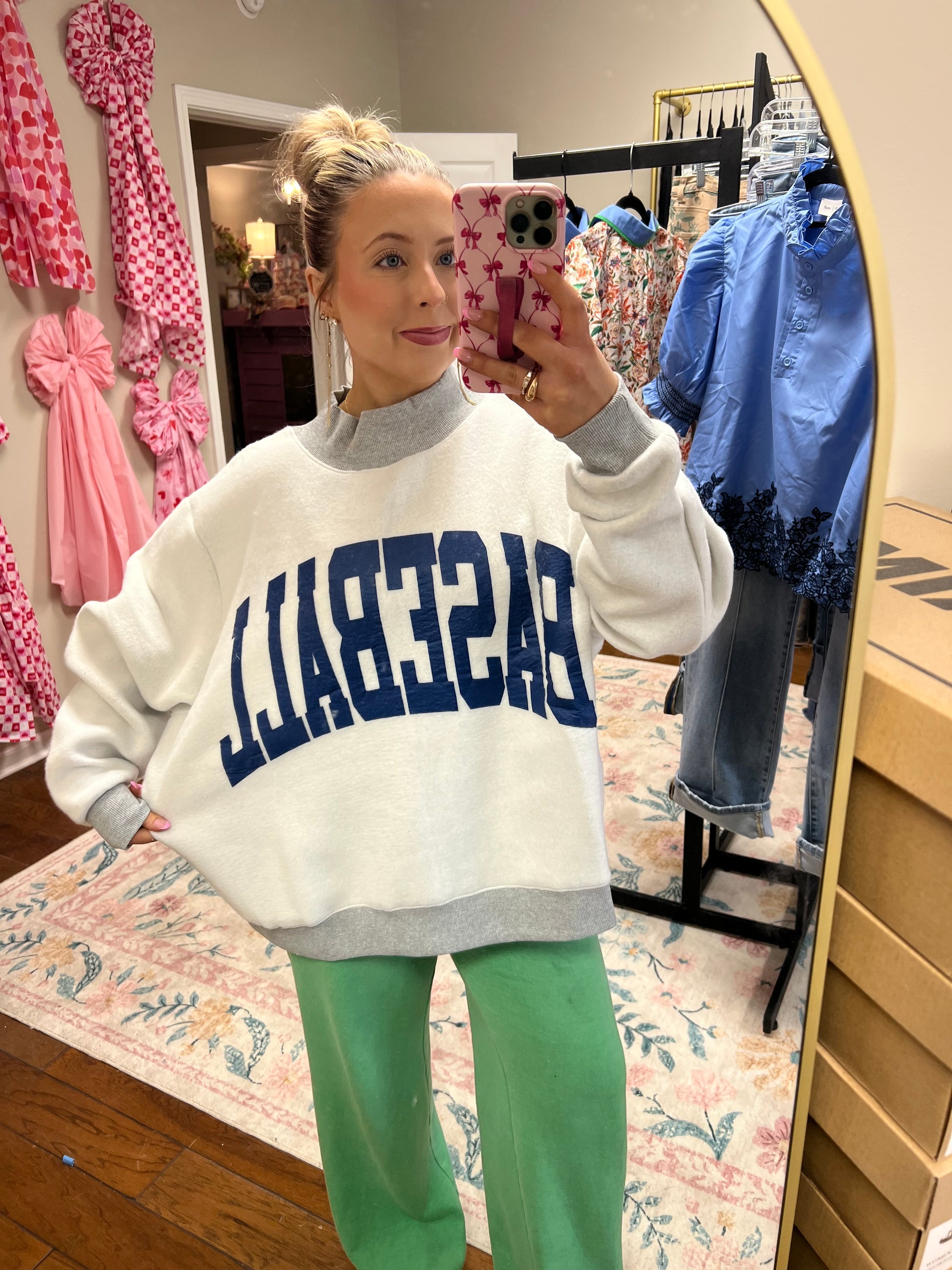 Take Me Out to the Ballgame! The ever popular style mock neck, baseball edition. Baseball on one side, and Polka Dots on the other. Grey in color with Navy polka dots.