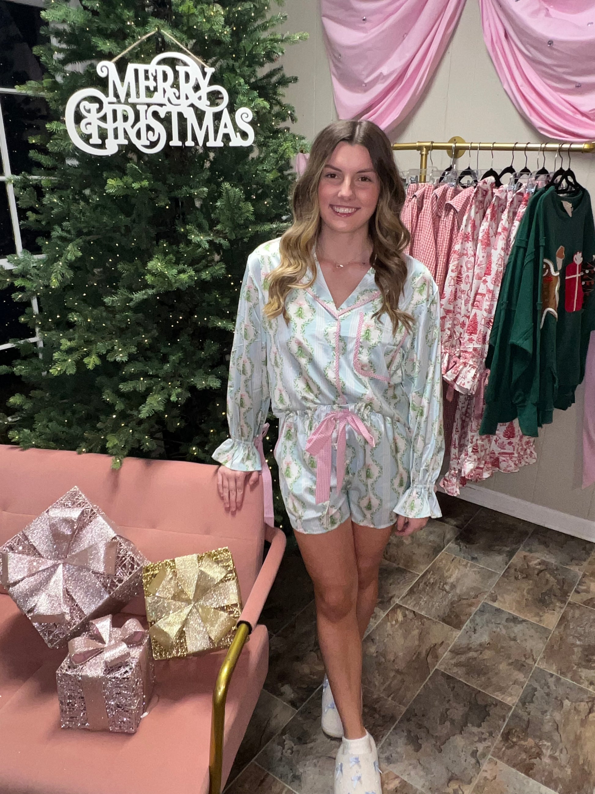 Satin baby blue pajama set with dainty Christmas trees, and light pink gingham detailing.