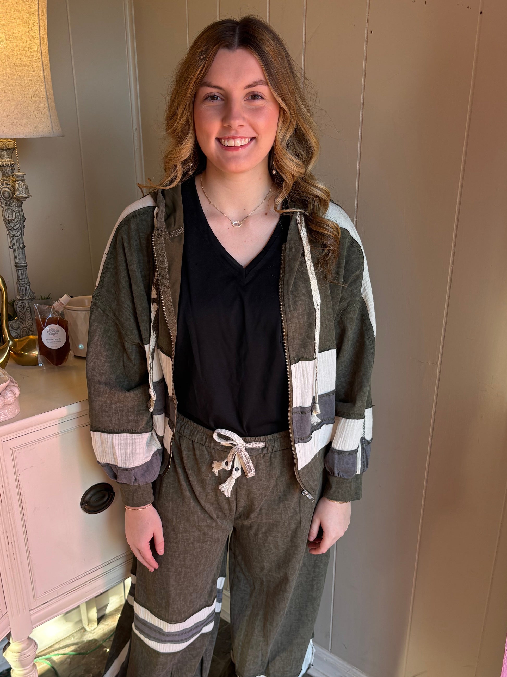 Light weight zipper front, mineral washed, olive with fabric stripe detailing
