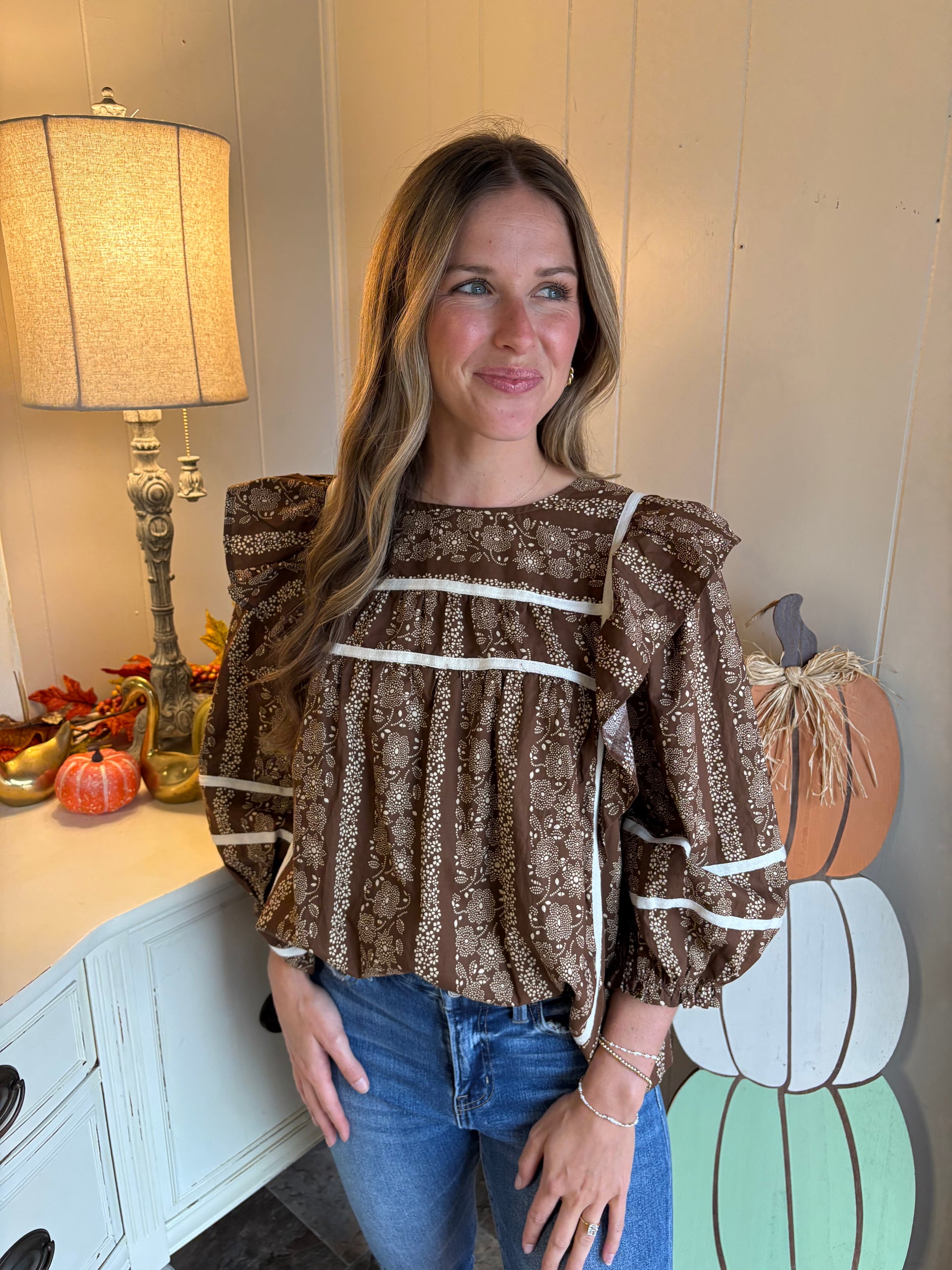 Floral print round neck 3/4 sleeve top featuring piping detail.