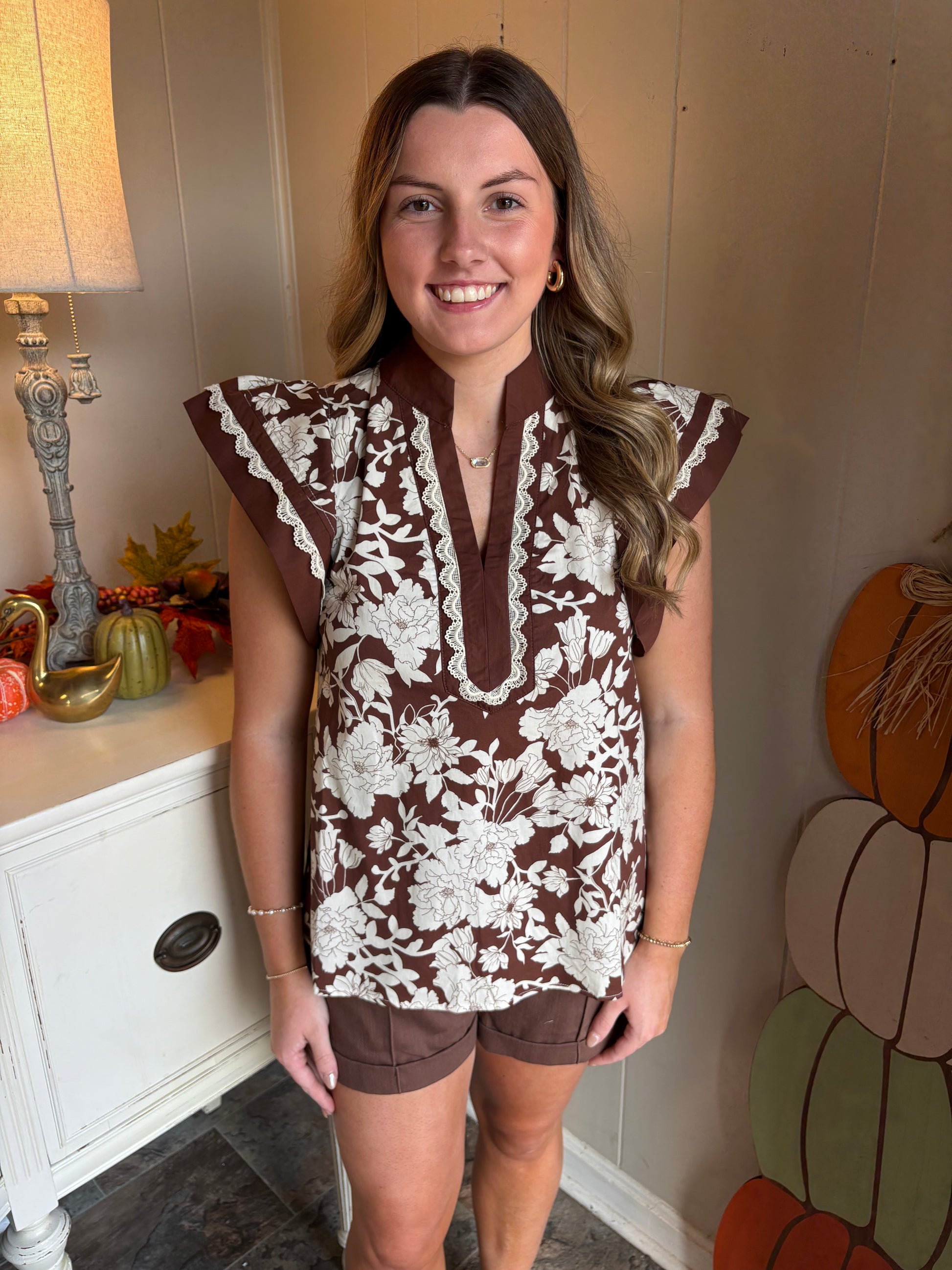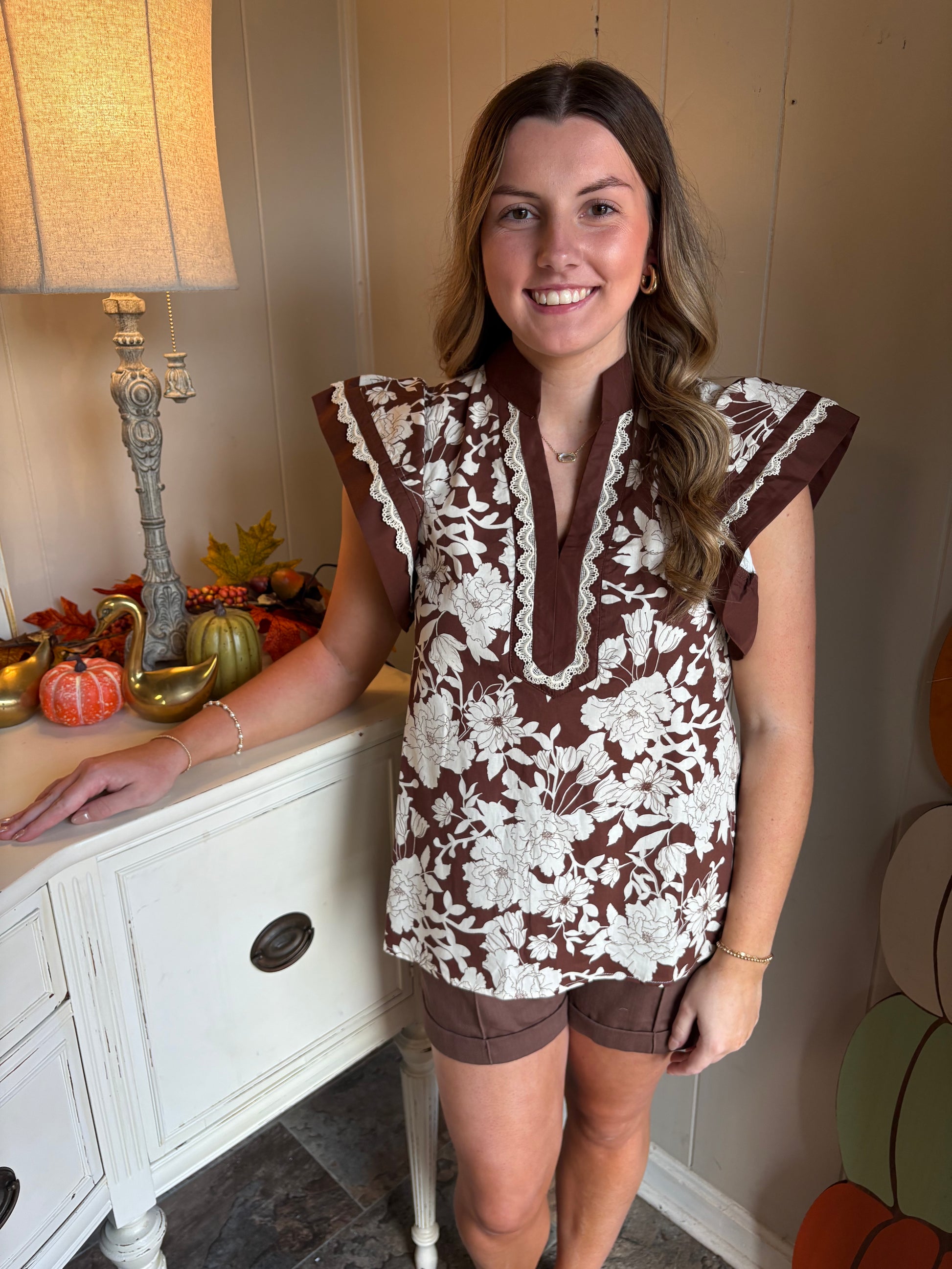 This mocha-brown lace top brings fall florals to life! Split neck, delicate lace details, flutter sleeves make this piece the perfect autumn top for these days that the temperature can’t make up its mind!