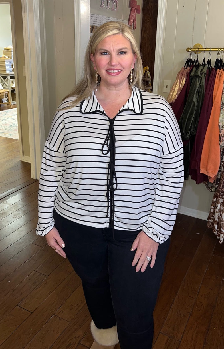 White buttery soft top with black stripes. Black trim down front center with bows.