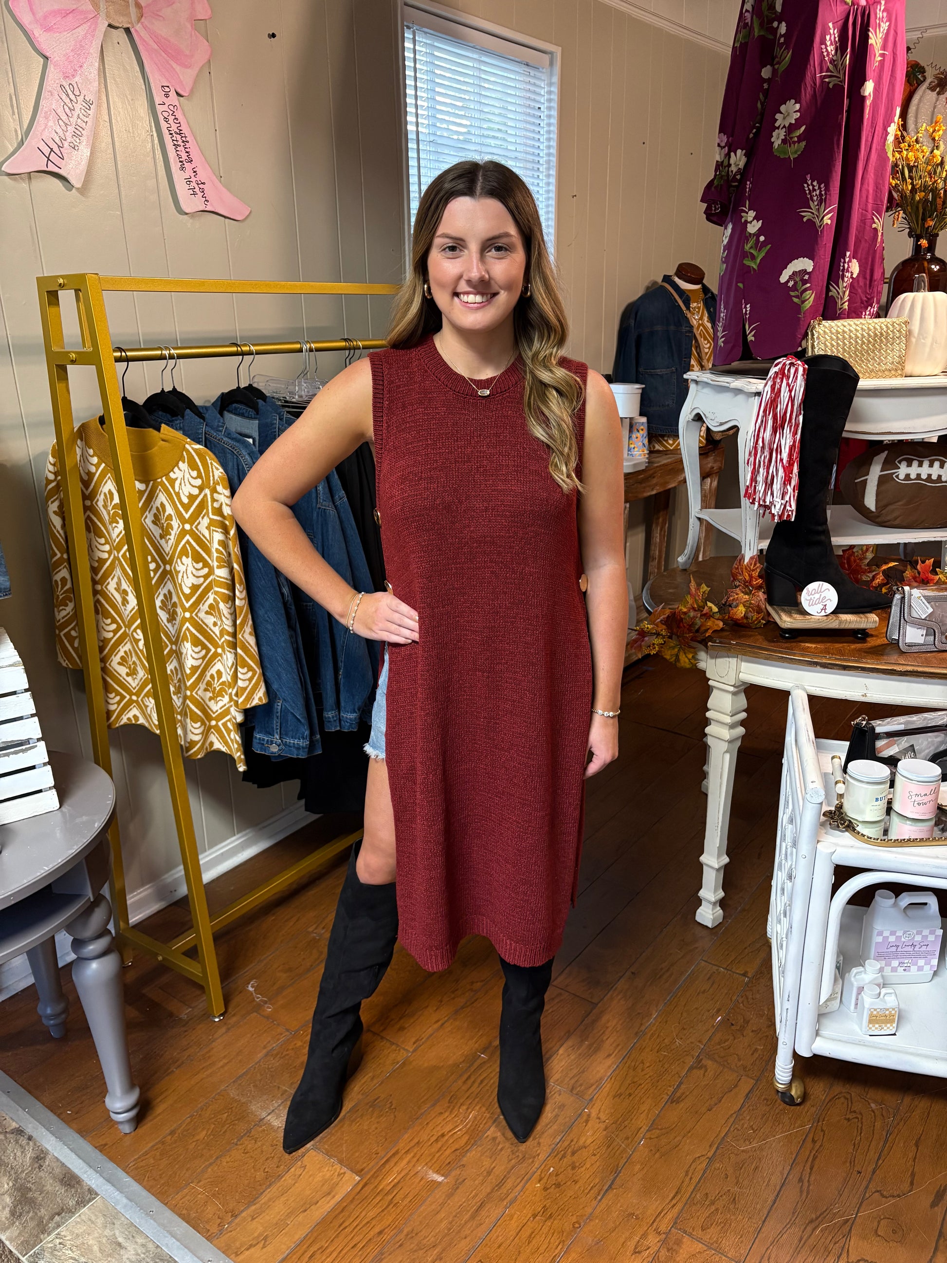 This sleeveless longline sweater vest features a soft open knit texture, oversized armholes, deep side slits accented with bold, glossy marbled buttons, and a relaxed, tunic length silhouette for effortless layering with elevated edge