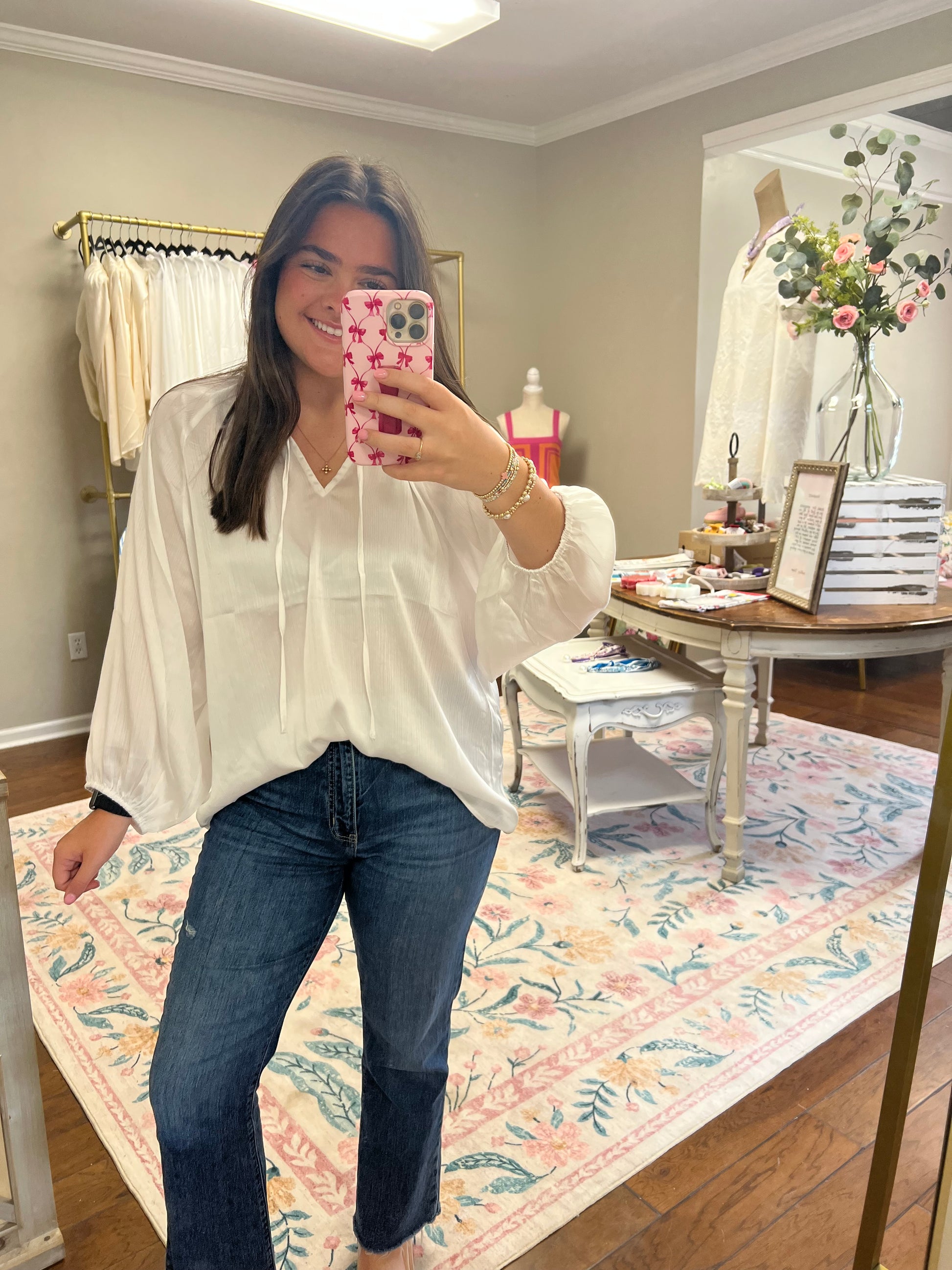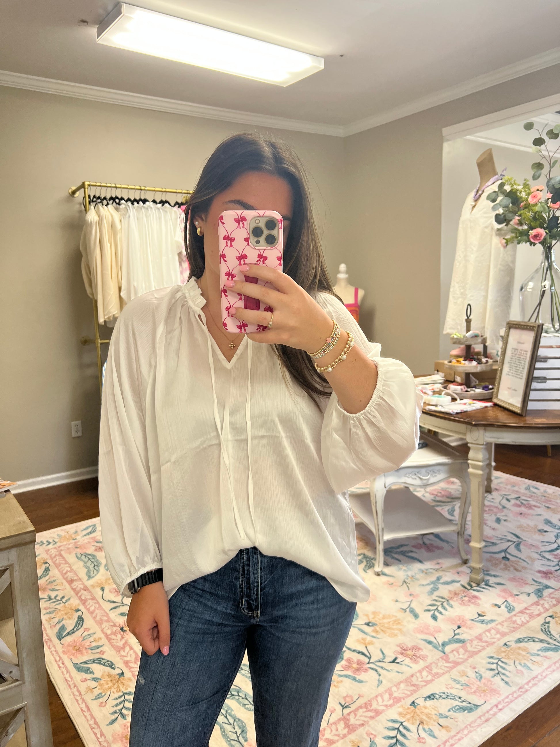 v-neck long sleeve satin top with an optional tie front. Cute and flowy top that can be worn everyday