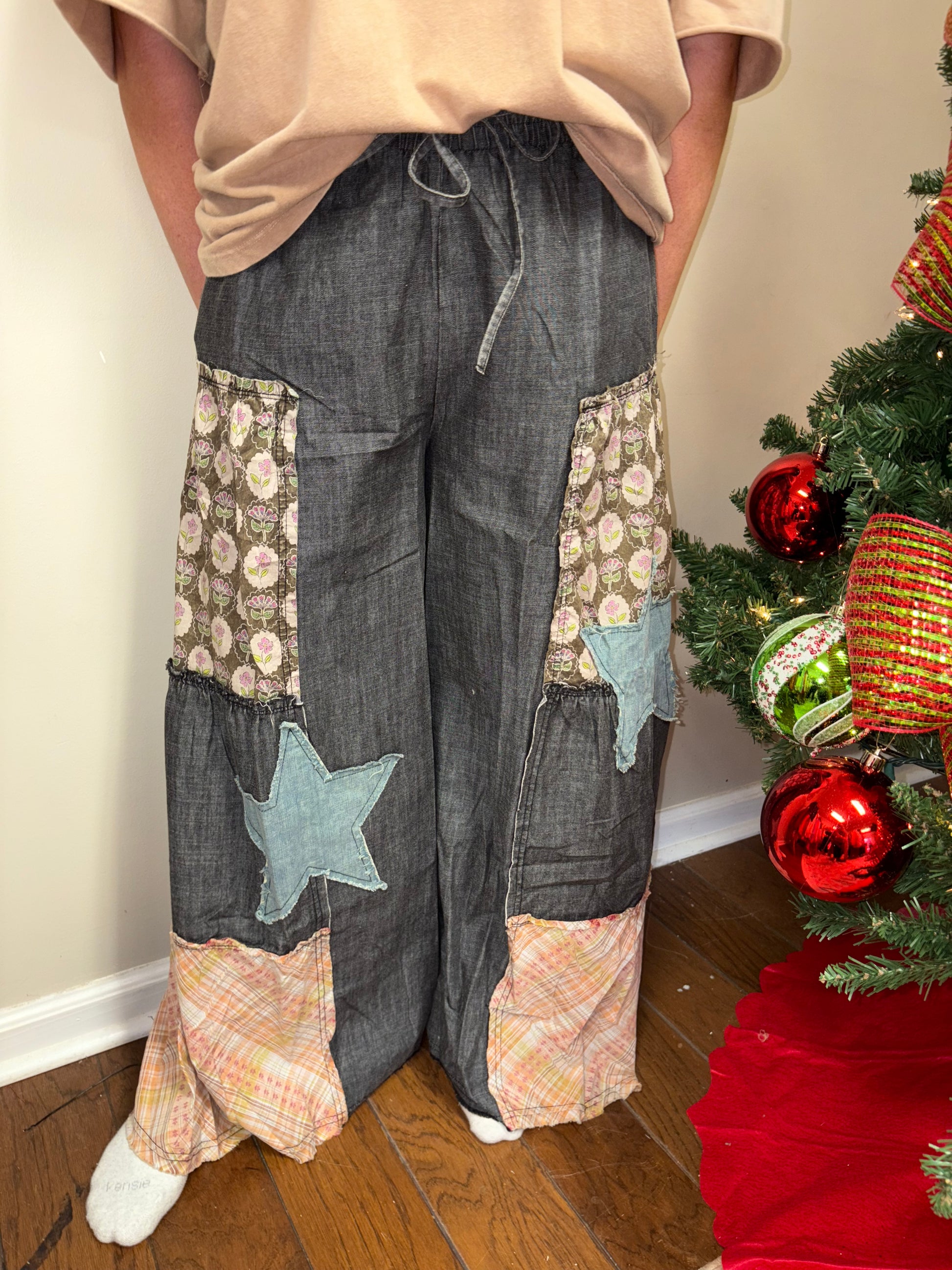 WASHED DENIM PATCHWORK PALAZZO PANTS