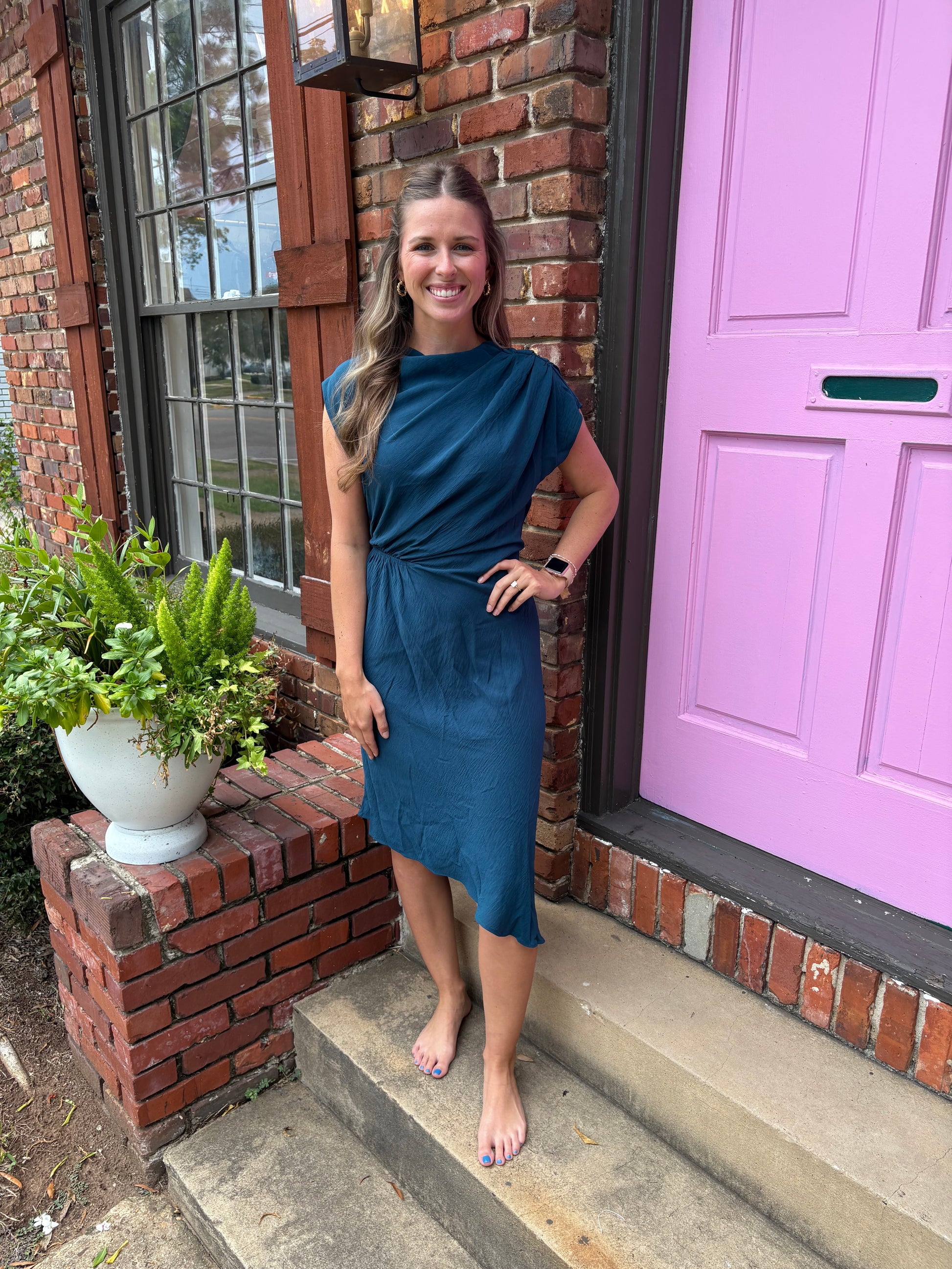 Uneven hem, draped neck, drop shoulder, midi dress