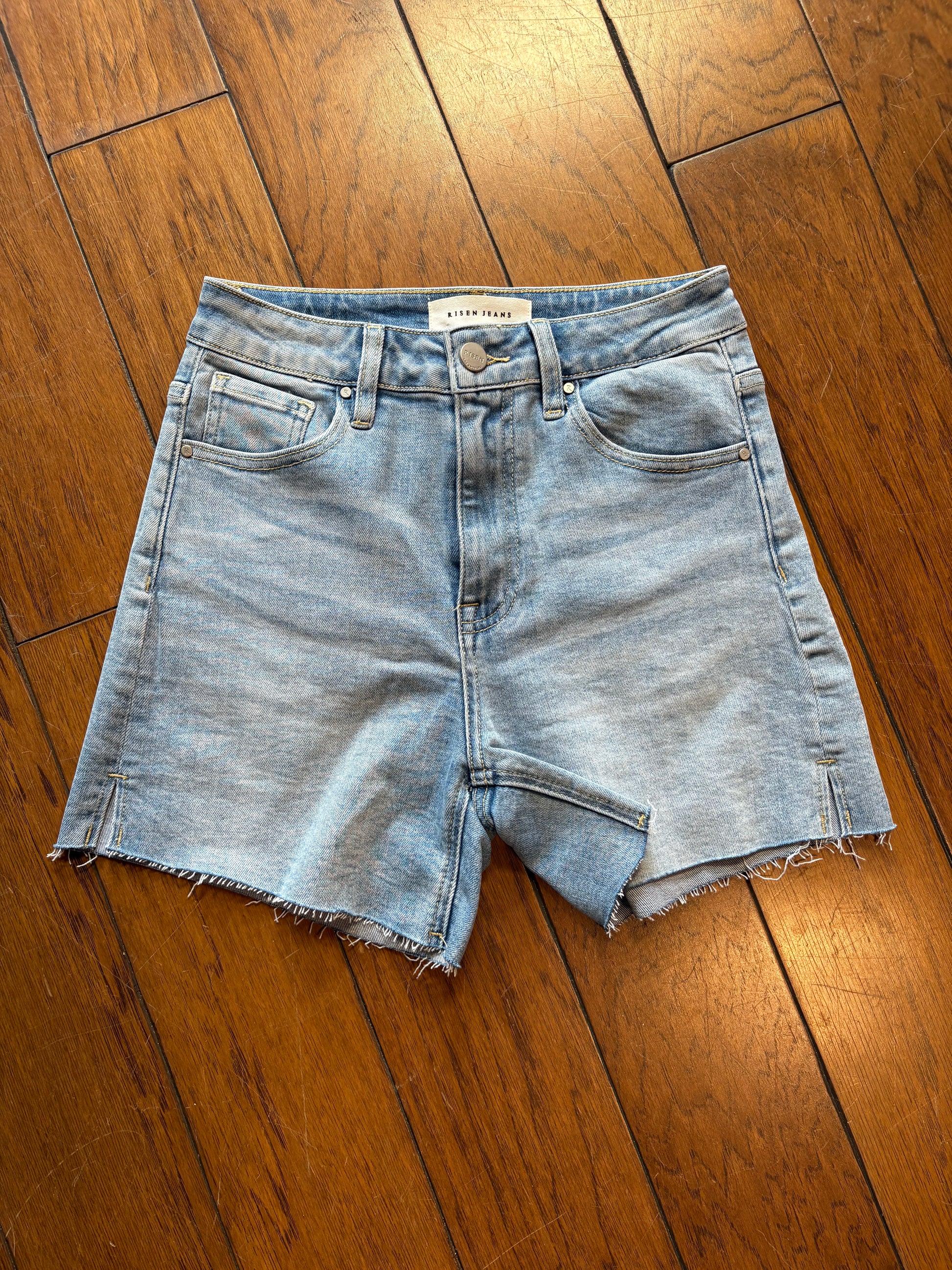 Risen High Rise Side Slit Denim Shorts
