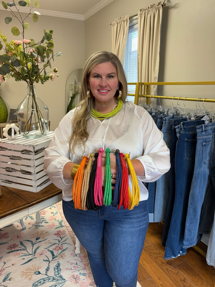 The necklace for any season. Necks will be cool and comfortable in this showstopper. 24-inches long with 8-strands of cotton roping. Easy ball-n-eye closure.