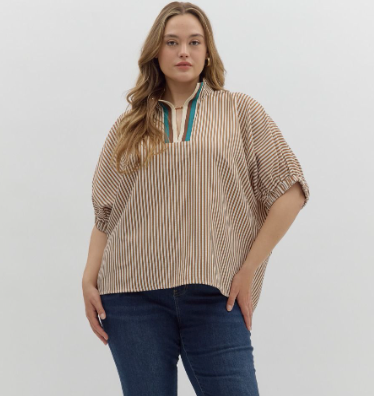 Stripe pattern high neck elasticated sleeve band dolman top featuring accented multicolor rib band split neck. Unlined. Woven. Non-sheer. Lightweight.